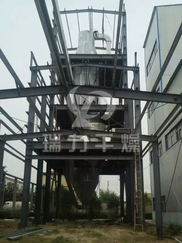 壓力噴霧干燥機工作過程為:料液通過隔膜泵高壓輸入,噴出霧狀液滴,然后同熱空氣并流下降,大部分粉粒由塔底排料口收集,廢氣及其微小粉末經旋風分離器分離,廢氣由抽風機排出,粉末由設在旋風分離器下的收粉筒收集,風機出口處還可裝備二級除塵裝置,回收率在96%-98%。