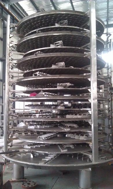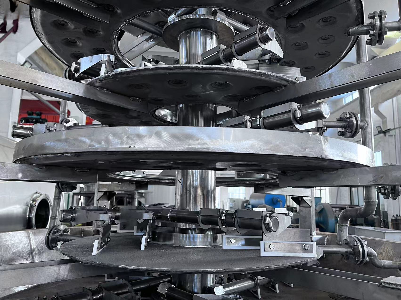 PLG系列盤式連續干燥機的一層盤上,帶有耙葉的耙臂做回轉運動,使耙葉連續地翻轉物料,物料沿著指數螺旋線流過干燥盤表面,在小干燥盤上的物料移到外緣,并在外緣落到下方的大干燥盤外緣,在大干燥盤上的物料向里移動并從中間落料落入下一層小干燥盤中,大小干燥盤上下交替排列,物料得以連續地流過整個干燥機,中空的干燥盤內通入加熱介質,加熱介質從一端進入另一端導出,已干燥物料從底層干燥盤落到殼體底層,最后被耙葉移動到料口排出。蒸發出來的水蒸汽由設置在頂部的排濕口排出,夾帶的粉塵由脈沖除塵器回收,尾氣由排濕風機排出室外。底部排出的干物料可直接包裝。