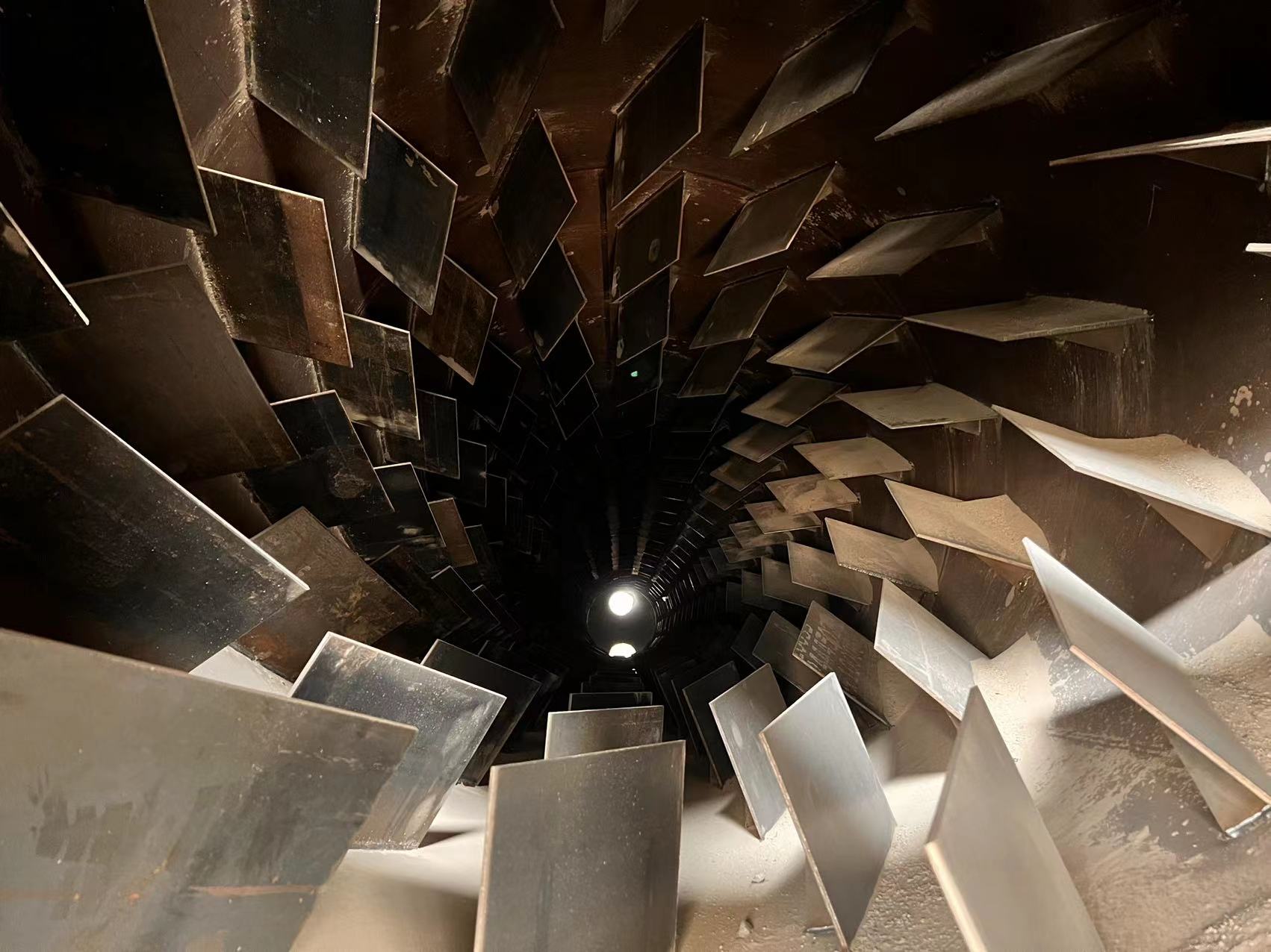 濕物料從干燥機(jī)一端投入后,在內(nèi)筒均布的抄板器翻動(dòng)下,物料在干燥器內(nèi)均勻分布與分散,且與并流( 逆流 )的熱空氣充分接觸 ,加快了干燥傳流、傳質(zhì)推動(dòng)力。在干燥過(guò)程中,物料在帶有傾斜的抄板和熱氣流作用下,可調(diào)控地運(yùn)動(dòng)至干燥機(jī)另一端星形卸料閥排出成品。