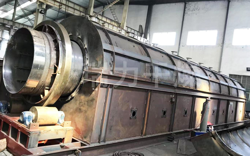 先通過天然氣燃燒器在燃燒室燃燒,將旋轉的回轉滾筒筒體加熱均勻。物料通過定量加料器將物料送入回轉滾筒內部,通過筒體的旋轉和筒體的傾斜度,使物料不斷地向前移動。在移動的過程中,加熱后的筒體將熱量傳遞給物料,使物料溫度上升,產品得到煅燒,煅燒后的產品成高溫狀態從尾端排出.高溫間接煅燒窯,它包括主傳動裝置、窯體和與其下部相接的燃燒系統,窯體由前至后依次設有喂料與攪拌機構、料斗、回轉窯筒體與尾罩;其中,回轉窯筒體通設于所述窯體且延伸出該窯體兩端,回轉窯筒體的進口端與所述料斗出口端相接,回轉窯筒體的出口端與尾罩相接,主傳動裝置設置于該回轉窯筒體的前端或后端。