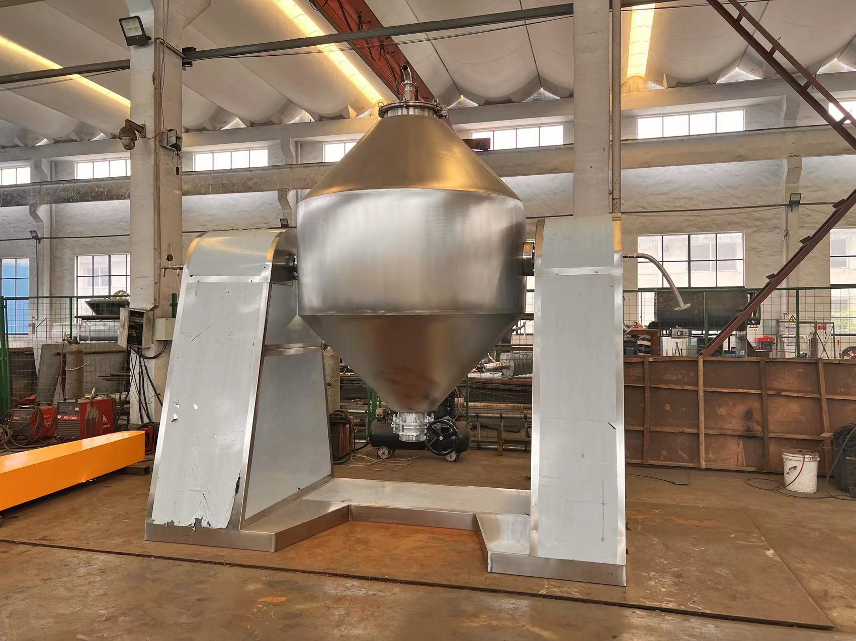 SZG系列雙錐回轉真空干燥機是集混合、干燥于一體的新型干燥機。將冷凝器,真空泵與干燥設備配套,組成真空干燥裝置。(如不需要回收溶劑,冷凝器可不用)本機設計合理,內部結構簡單,清掃容易,物料能全部排出,操作簡便。能降低勞動強度,改善工作環境。同時因容器本身回轉時物料亦轉動,但器壁上不積料,故傳熱系數高,干燥速率大,不僅節約能源,而且物料干燥均勻充分,質量好。可廣泛應用于制藥、化工、食品、染料等行業的干燥。