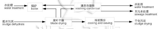 (2)熱源產(chǎn)生。可使用熱蒸汽或熱油作為熱交換的熱源。一般熱流體的溫度為180℃-200℃。熱介質(zhì)分別被引入中空的干燥機(jī)殼體和轉(zhuǎn)動(dòng)的軸槳葉等所有與污泥接觸進(jìn)行熱交換的加熱金屬表面。